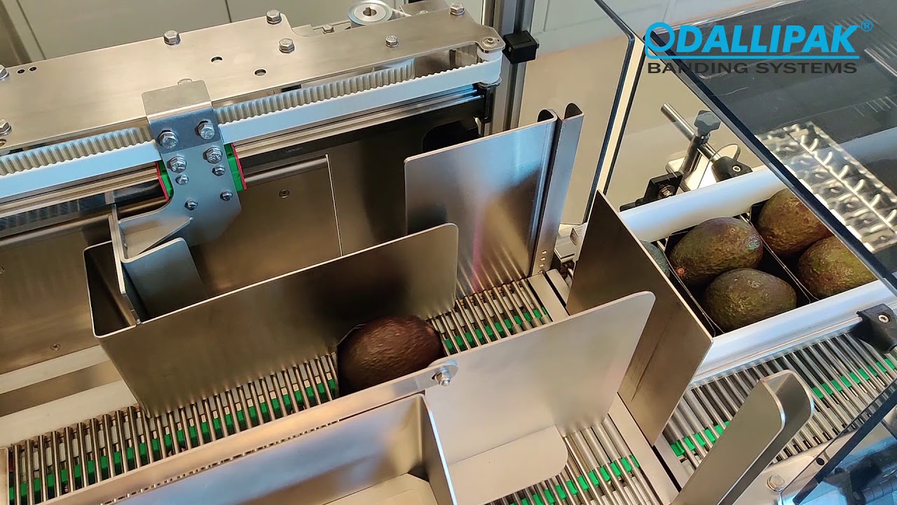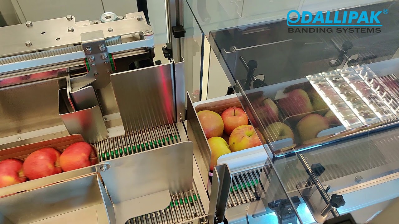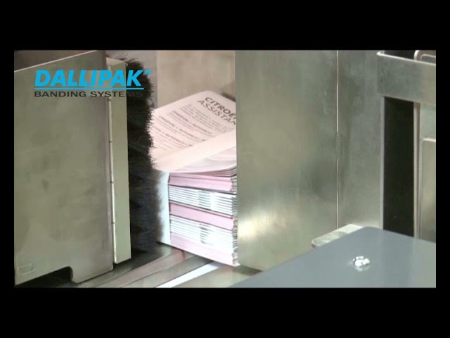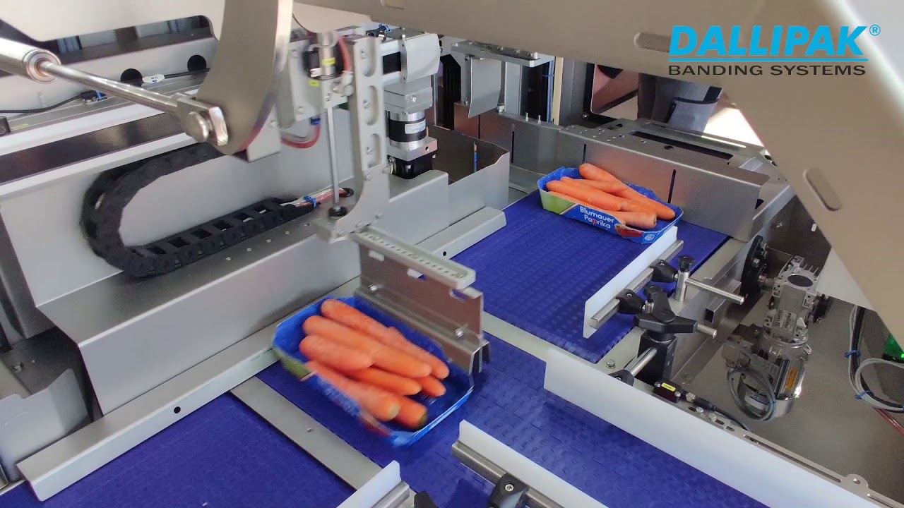 Banderolierung von ungleichmäßig einlaufenden Produkten. Die Produkte werden in der gleichen Richtung banderoliert, wie sie übernommen werden.